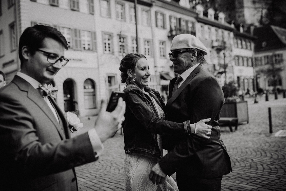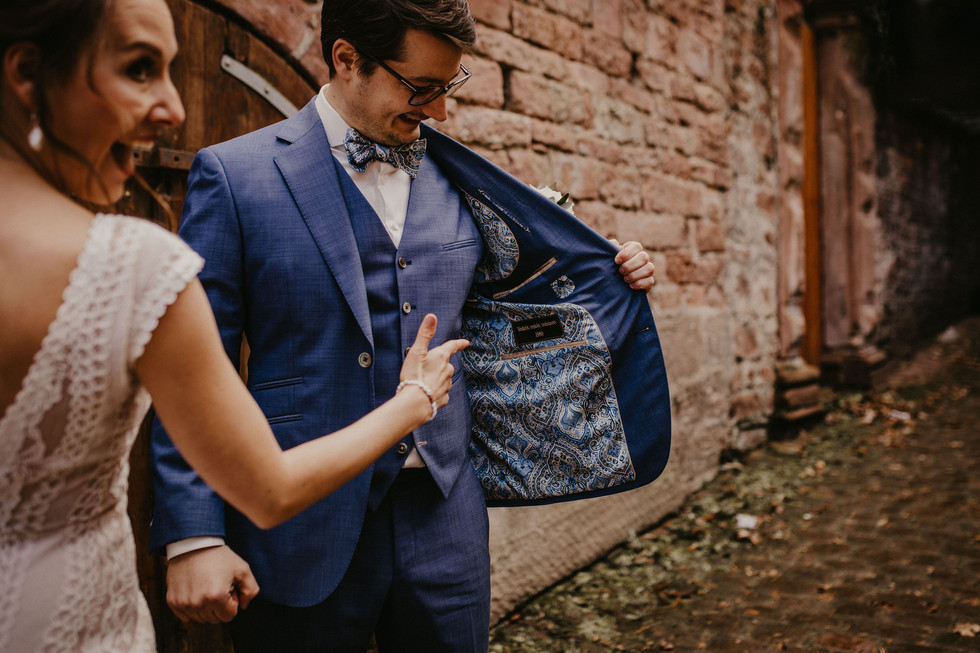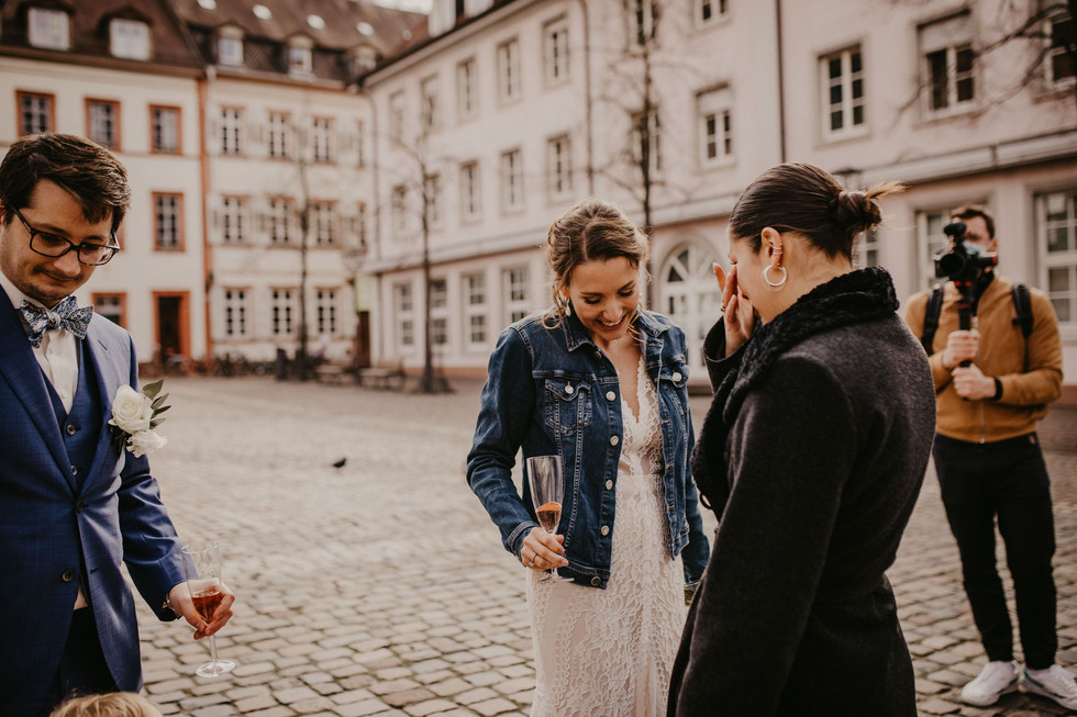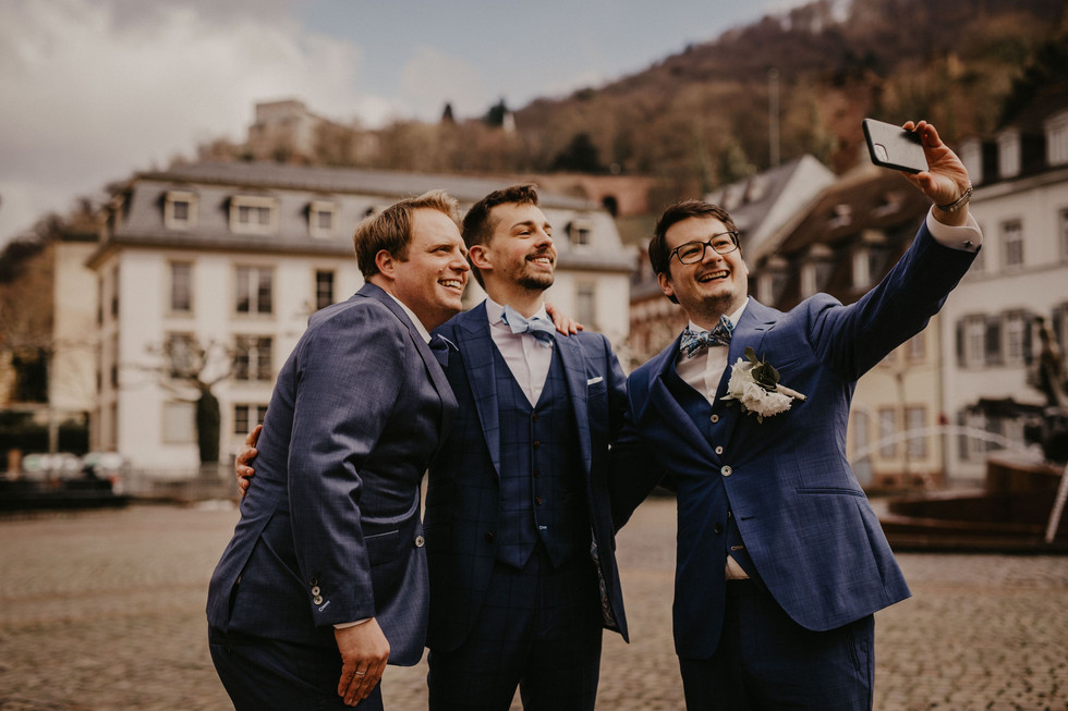 Ich hatte nämlich im Vorfeld Fotos von Nadines Brautkleid gesehen und wusste: Das wird kalt und unangenehm für die Arme. Aber jetzt kommt das unglaubliche: Just in dem Moment, als Braut, Brautmutter, Trauzeugin und der Videograph Kevin auftauchten, hörte der unangenehme Graupel auf und das Wetter beruhigte sich! Wir konnten wir geplant einen wunderschönen emotionalen First Look shooten, machten im Anschluss ein paar sonnige Hochzeitsportraits in der Heidelberger Altstadt und ich durfte zur Krönung des Ganzen sogar mit ins Standesamt, um die Trauung der beiden zu dokumentieren! Das ist heutzutage garnicht so selbstverständlich ;)